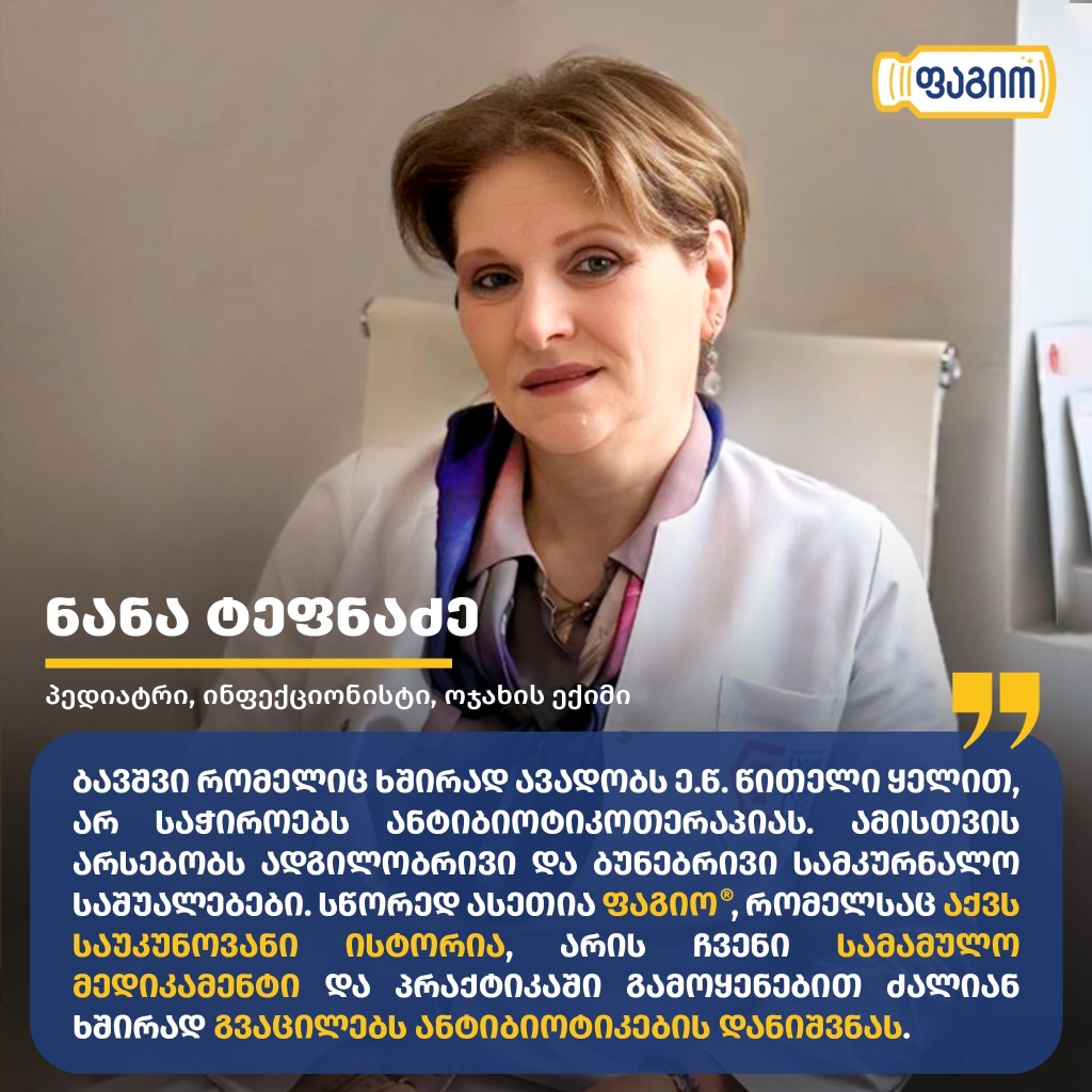 გასათვალისწინებელია, რომ ბავშვი რომელიც ხშირად ავადობს ეგრეთ წოდებული წითელი ყელით, არ საჭიროებს ანტიბიოტიკოთერაპიას. ამისთვის არსებობს ადგილობრივი და ბუნებრივი სამკურნალო საშუალებები. სწორედ ასეთია ფაგიო®, რომელსაც აქვს საუკუნოვანი ისტორია, არის ჩვენი სამამულო მედიკამენტი და პრაქტიკაში გამოყენებით ძალიან ხშირად გვაცილებს ანტიბიოტიკების დანიშვნას.”